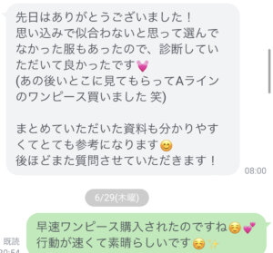 思い込みで似合わないと思って選んでなかった服もあったので、診断していただいて良かったです♡