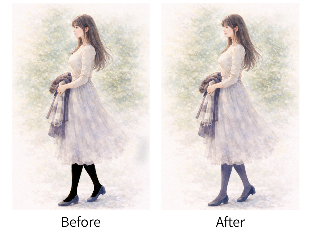 タイツ込みのトータルで柔らかに仕上げていく