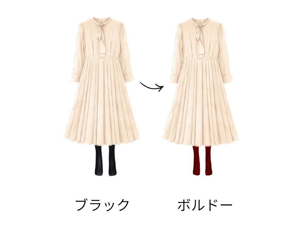 コーディネートのどこかにコントラストが少しでも入れば似合うので、黒タイツに合わせる時はコーディネート全体の中で考えてみてください♪