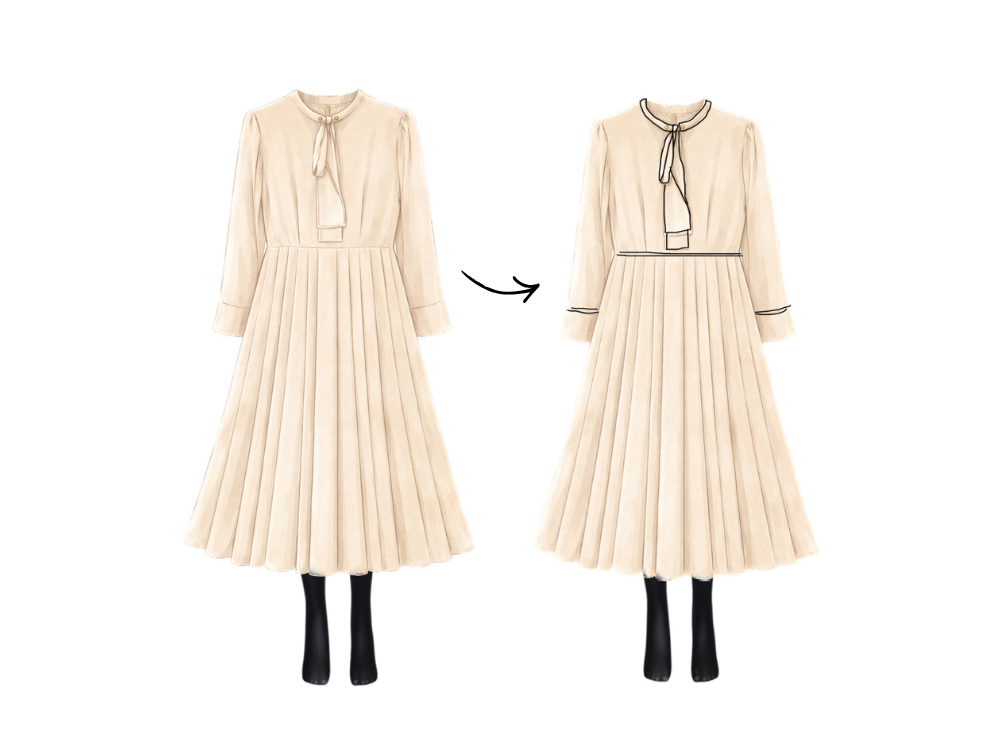 (例)ベージュのボウタイワンピース。ストッキングや黒のタイツと合わせるとアクティブキュートタイプには地味になってしまう。
